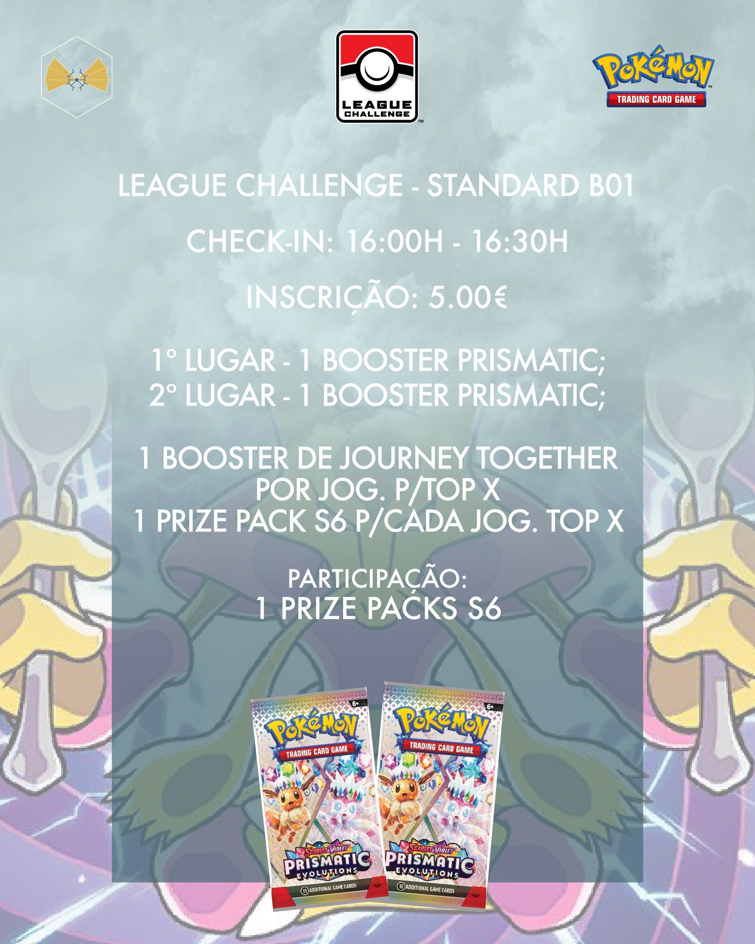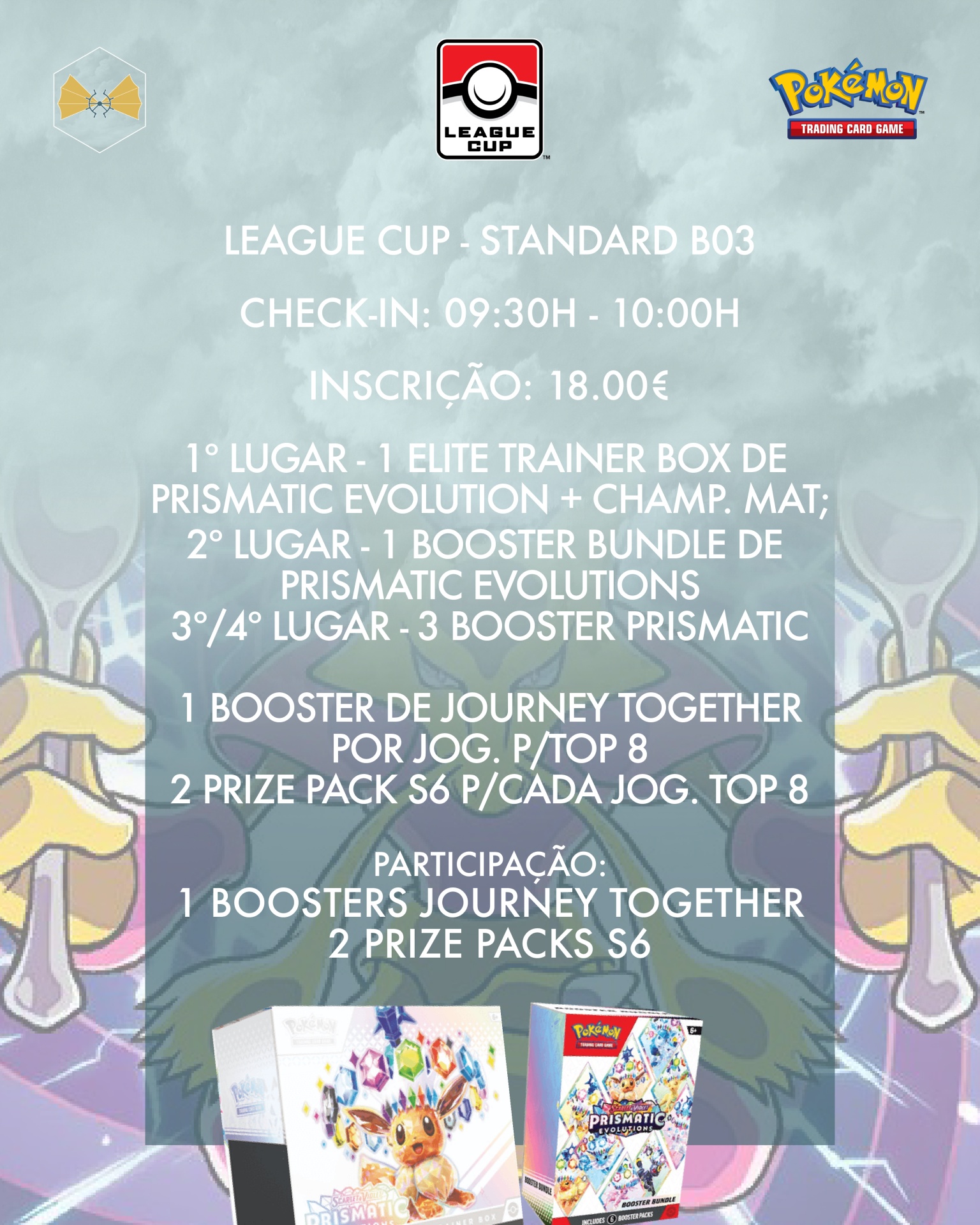 Há muito para oferecer - Elite Trainer Box para o primeiro lugar, Booster Bundle para o segundo e boosters para o terceiro e quarto - a juntar aos boosters de Journey Together e Prize Packs S6 por jogador para o Top8 e de participação! 🔥