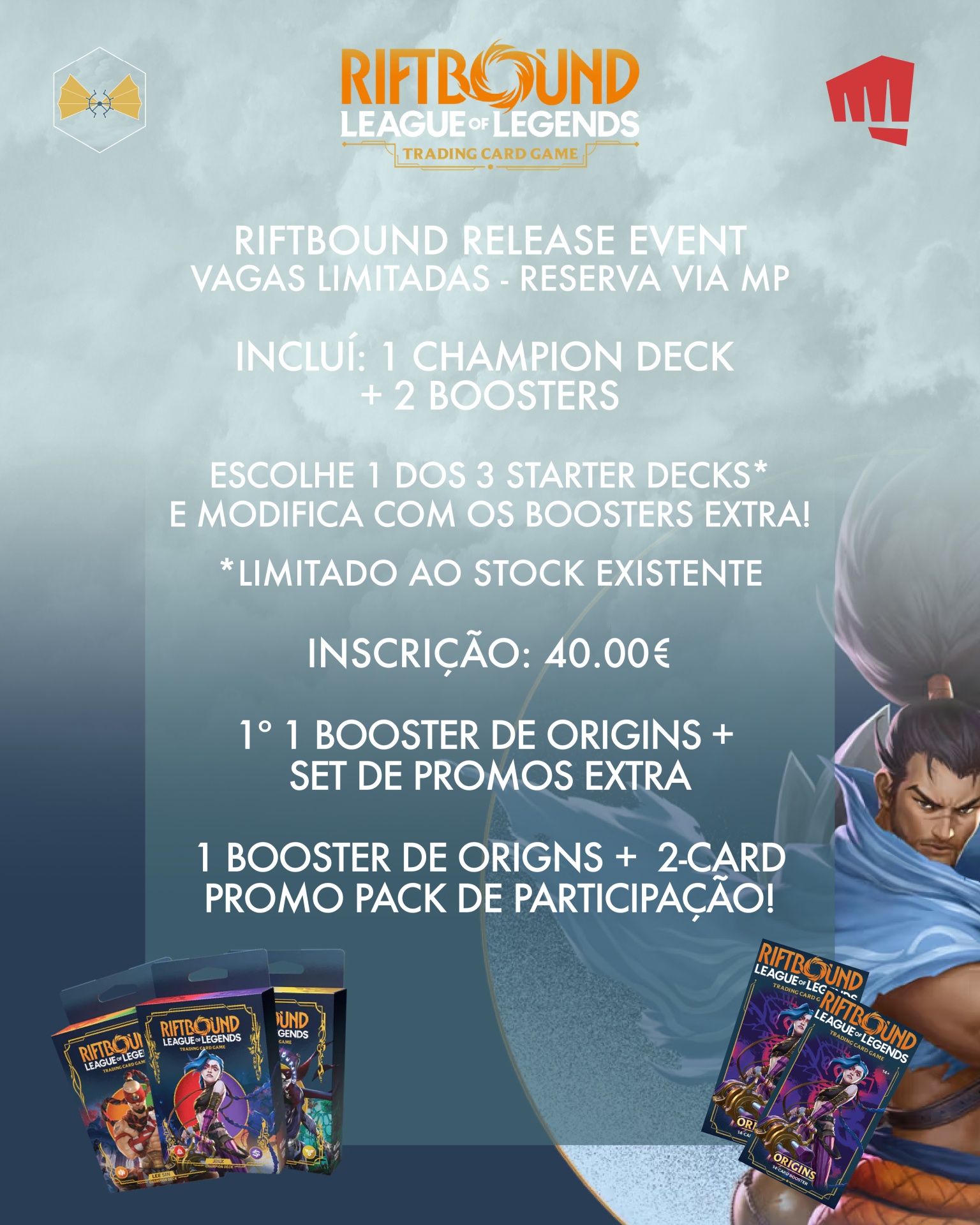 Escolhe 1 dos 3 Champion Decks pré-construídos, recebes 2 Boosters extra e junta-te à nossa comunidade para uma tarde que marcará o início de uma grande aventura ⚔️