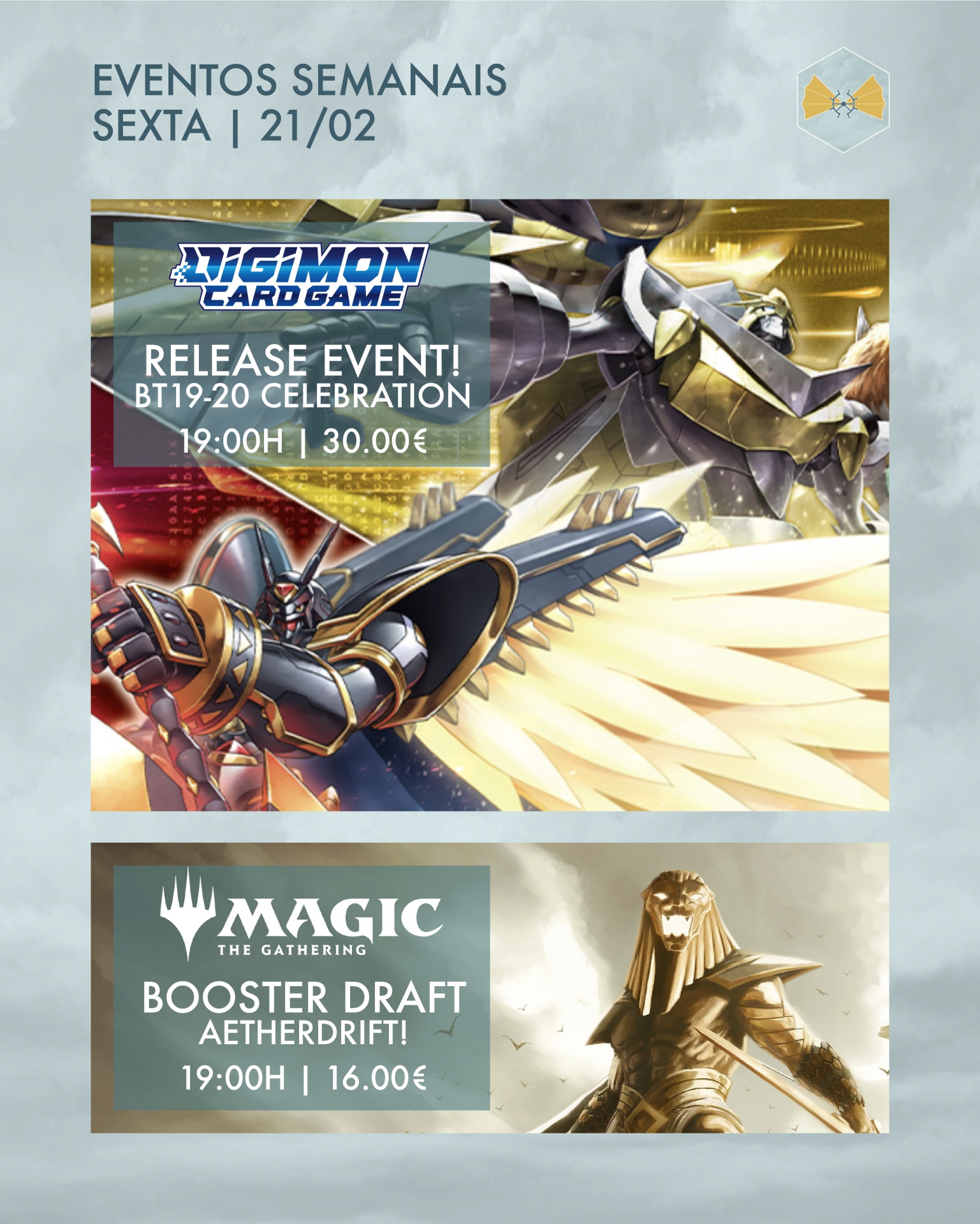 Destacamos o primeiro OTS Championship da Weatherlight no Yu-Gi-Oh, o Release Event da mais recente edição de Digimon e o League Challenge de Fevereiro no Pokémon! 🌟