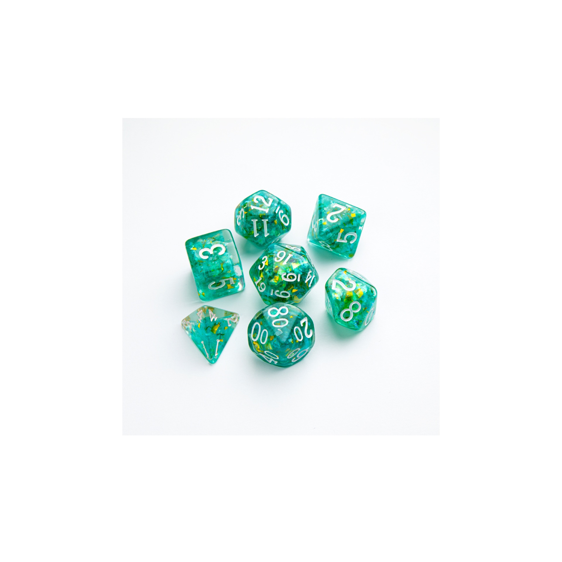 - Set of 7 premium quality resin dice. - CANDY-LIKE SERIES: inflused with beautiful glitter flakes; - Pack contains D4, D6, D8, D10 (10 and 00), D12 and D20; - All dice with smooth round edges; - Suitable for a variety of roleplaying games and the like.