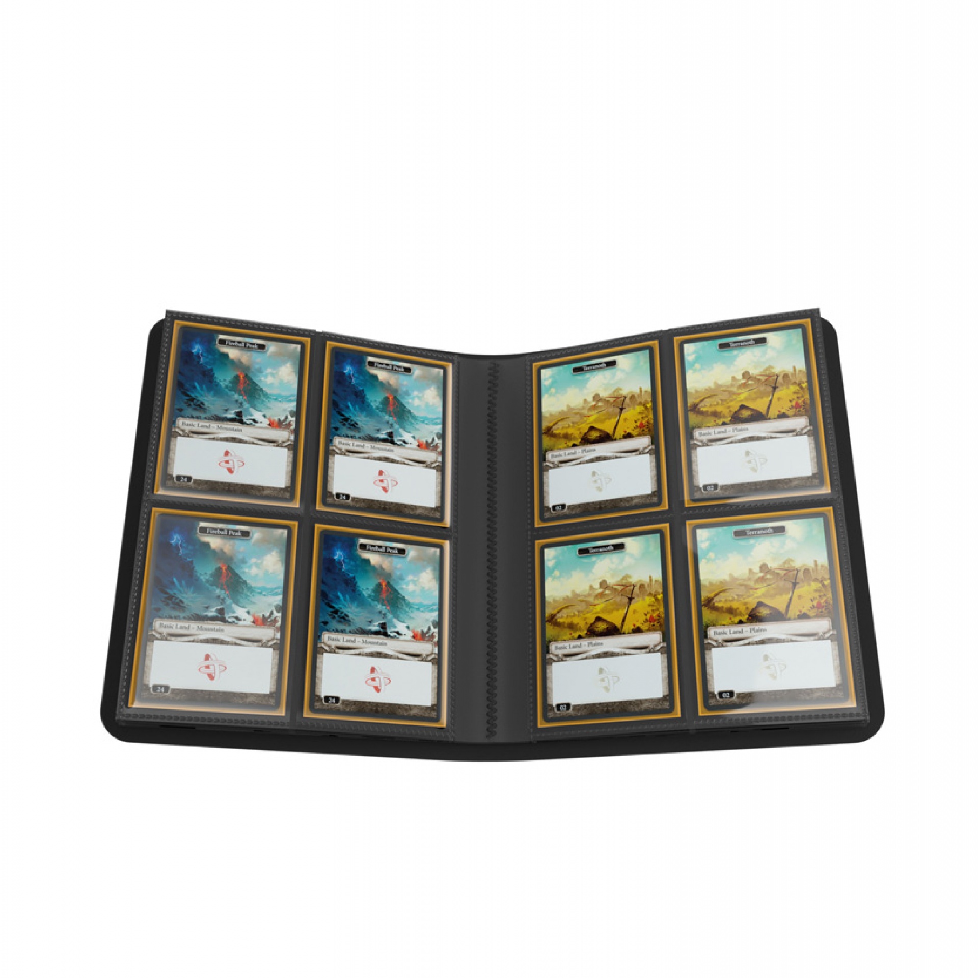 - 8 side-loading pockets per page keep cards shake-safe;