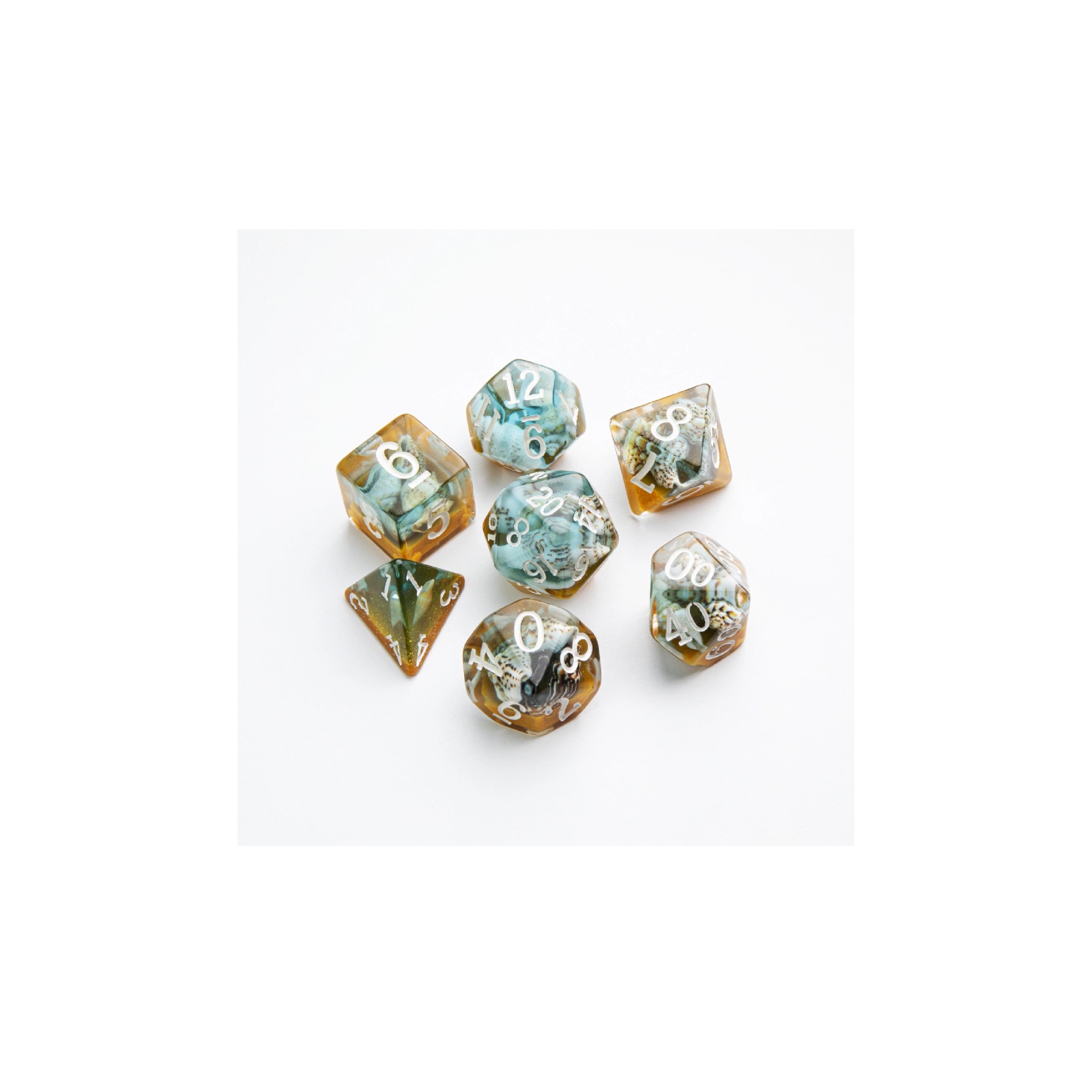 - Set of 7 premium quality resin dice; - EMBARCED SERIES: funny and unique item in each die; - Pack contains D4, D6, D8, D10 (10 and 00), D12 and D20; - All dice with smooth round edges; - Suitable for a cariety of roleplaying games and the like.