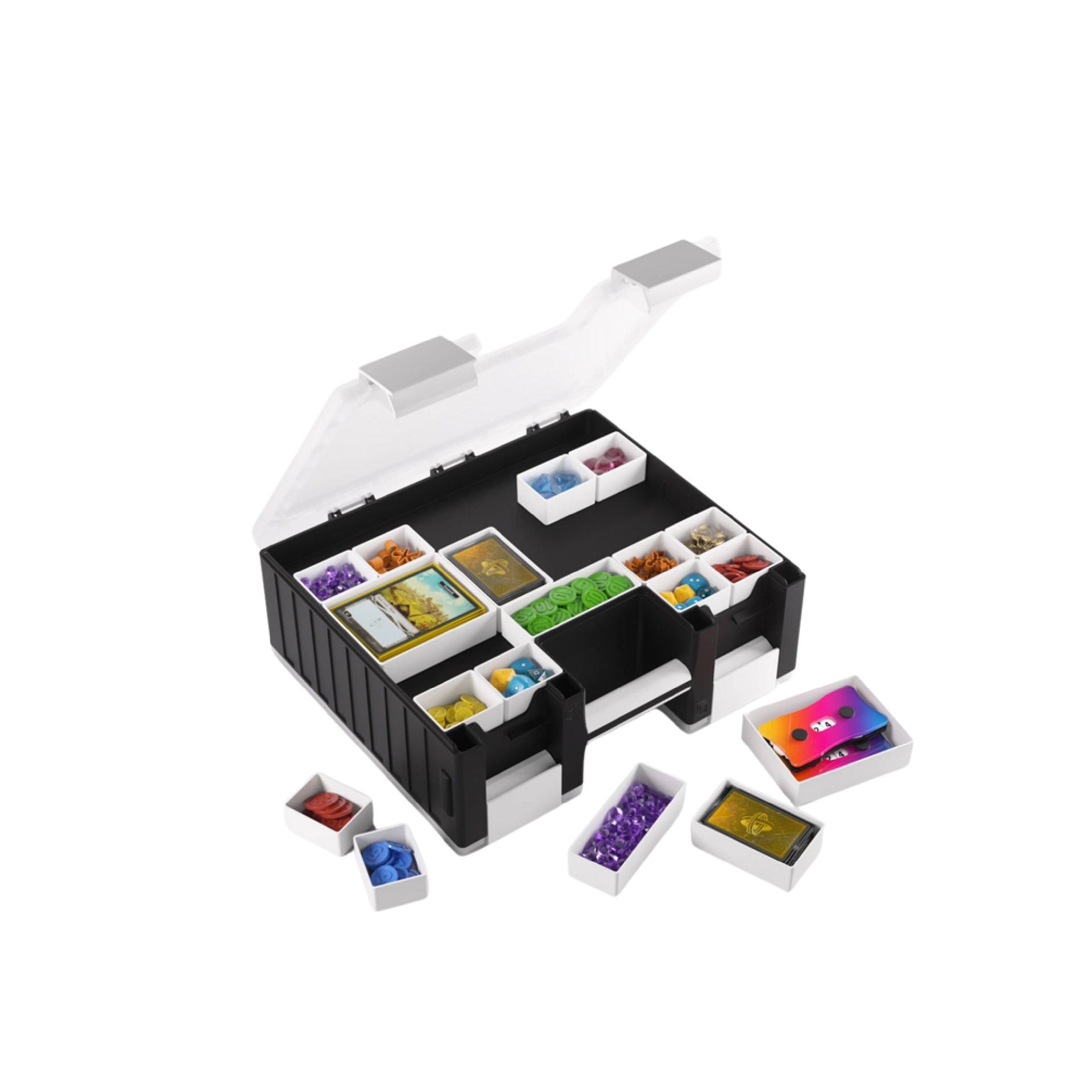 The Game Castle is an ingenious, double-sided, all-in-one solution for board gamers, card game players, and tabletop fans. This brand-new product can be opened on either side to allow separate access to a large number of cards and tokens. The innovative design provides safe storage while also enabling easy and comfortable transportation to game nights or tournaments with the integrated, reinforced handle and detachable, adjustable shoulder strap.