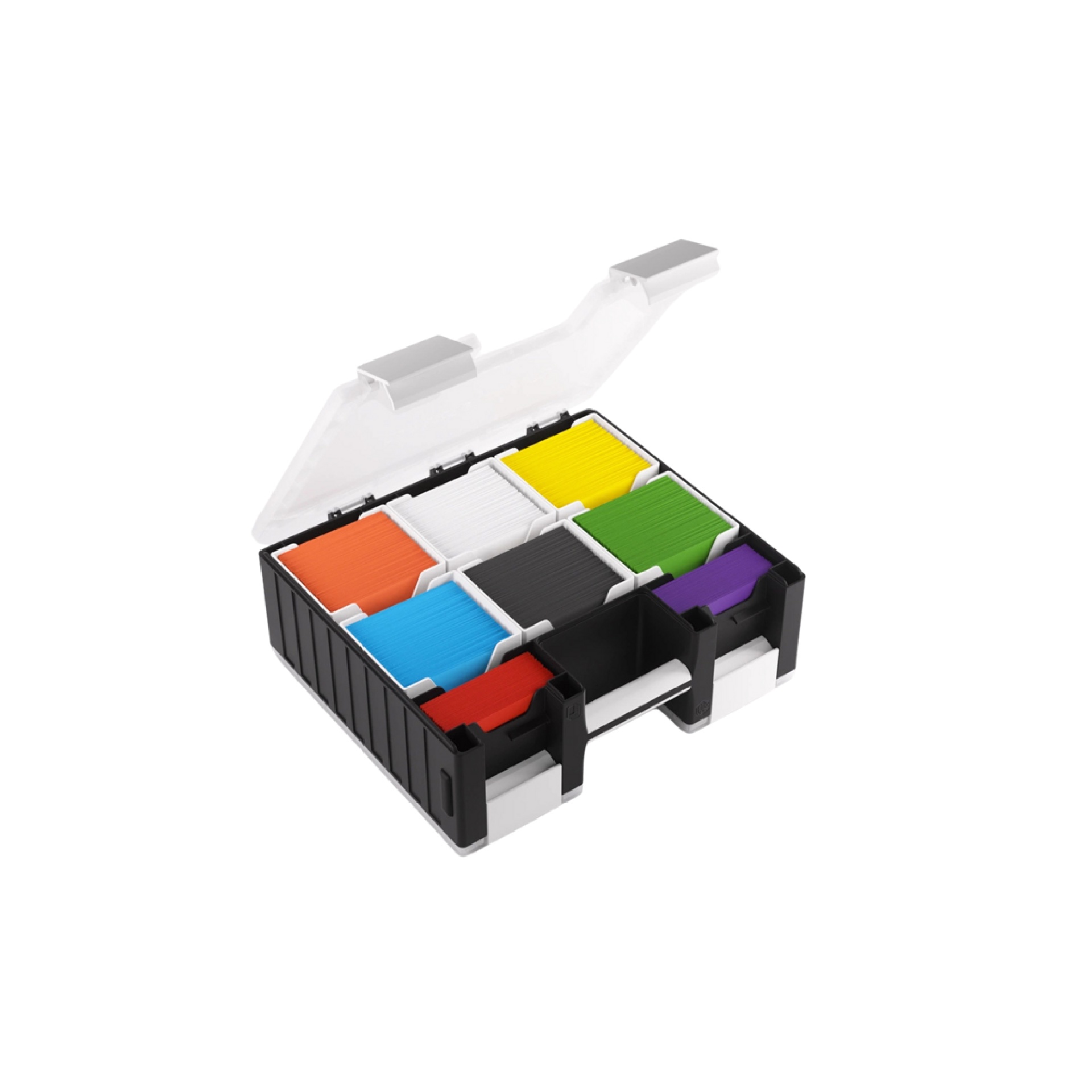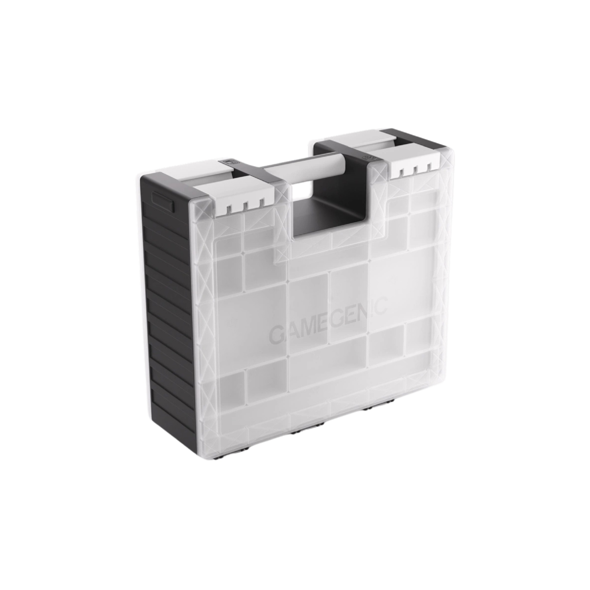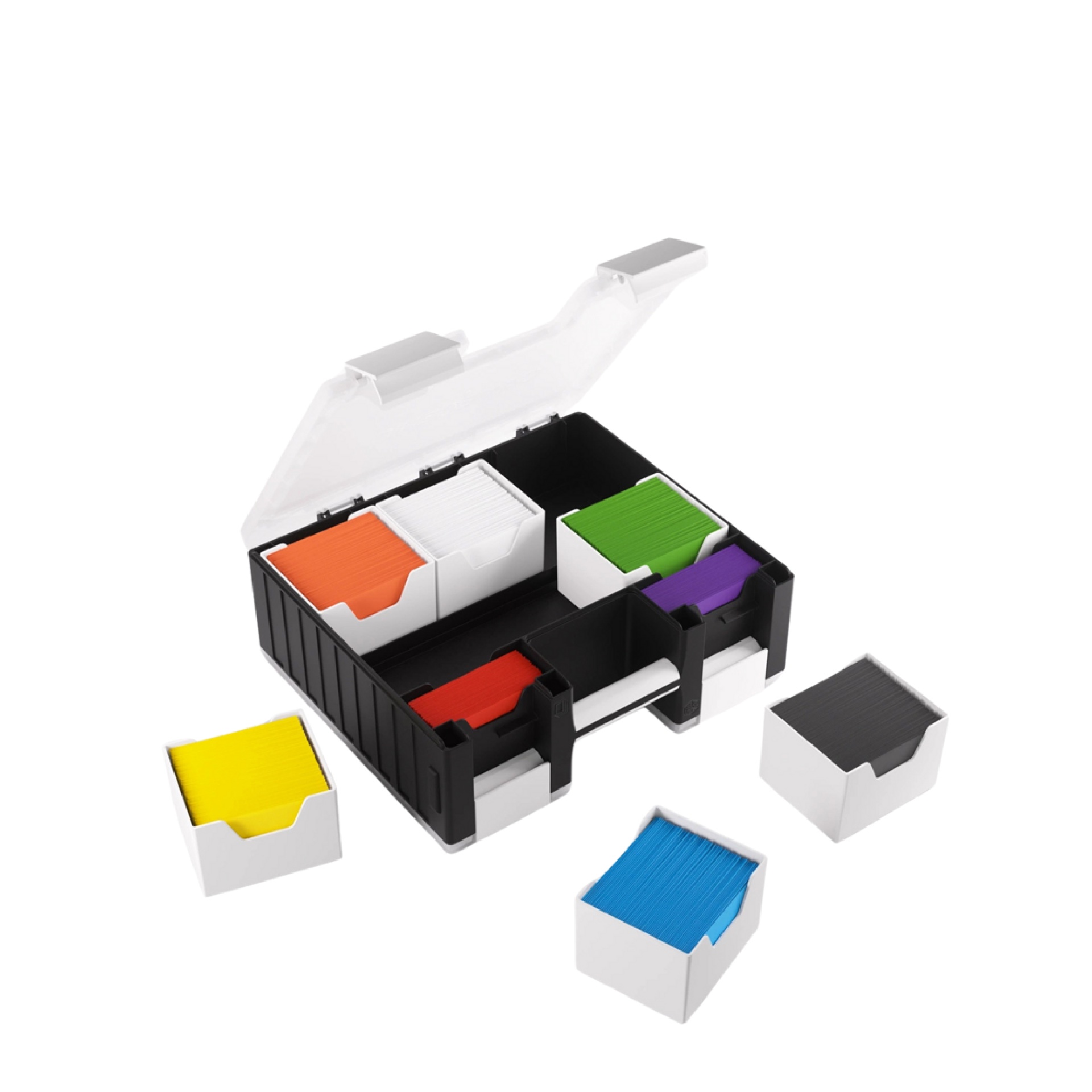 The Game Castle is a perfect storage solution for 6 Commander Decks (6x 100 double-sleeved cards), tokens, dice, movement/range tools, and many other gaming accessories! One side of the box houses six removable card holders for 600 double-sleeved cards in Thick Inner Sleeves or 800 board-game-sleeved cards. The other side holds 19 removable trays in 5 different sizes, including an extra-long tray to store movement/range tools, two trays in Mini-American card size, and two in Standard Card Game size. The trays can be swapped with those from the Gamegenic Token Silo and the Token Silo Cards Add-on, offering many different size and color combinations. The innovative clip mechanism ensures precise and secure closure.