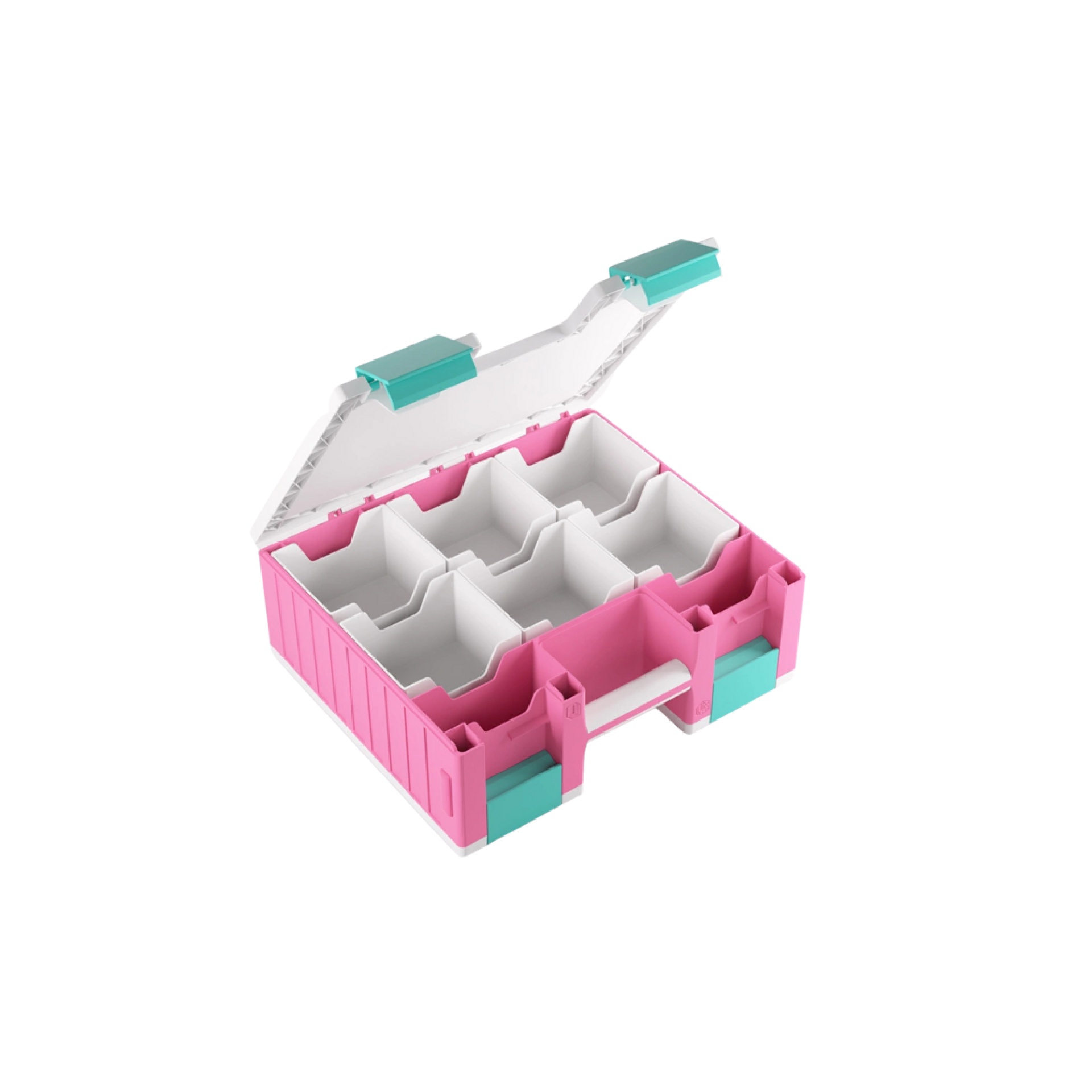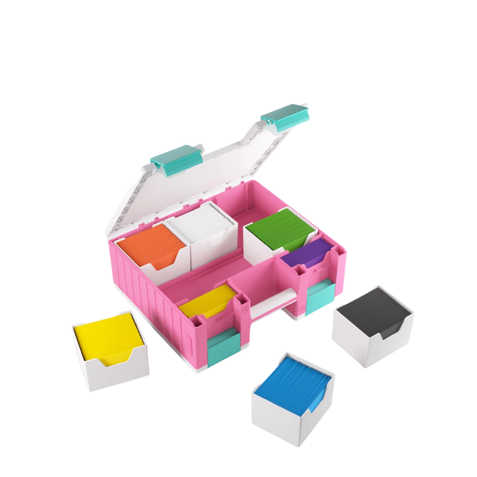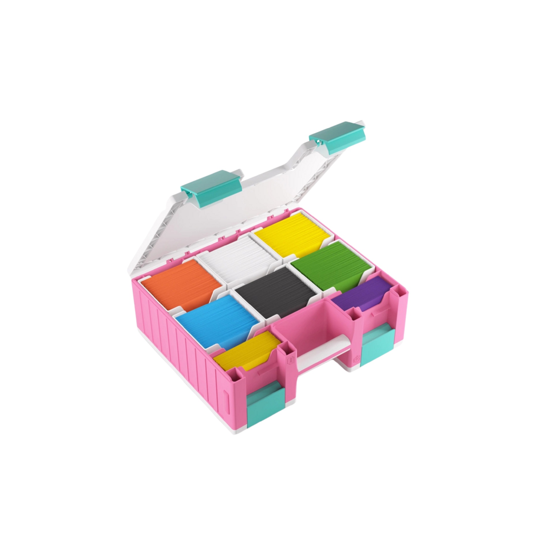 The Game Castle is a perfect storage solution for 6 Commander Decks (6x 100 double-sleeved cards), tokens, dice, movement/range tools, and many other gaming accessories! One side of the box houses six removable card holders for 600 double-sleeved cards in Thick Inner Sleeves or 800 board-game-sleeved cards. The other side holds 19 removable trays in 5 different sizes, including an extra-long tray to store movement/range tools, two trays in Mini-American card size, and two in Standard Card Game size. The trays can be swapped with those from the Gamegenic Token Silo and the Token Silo Cards Add-on, offering many different size and color combinations. The innovative clip mechanism ensures precise and secure closure.