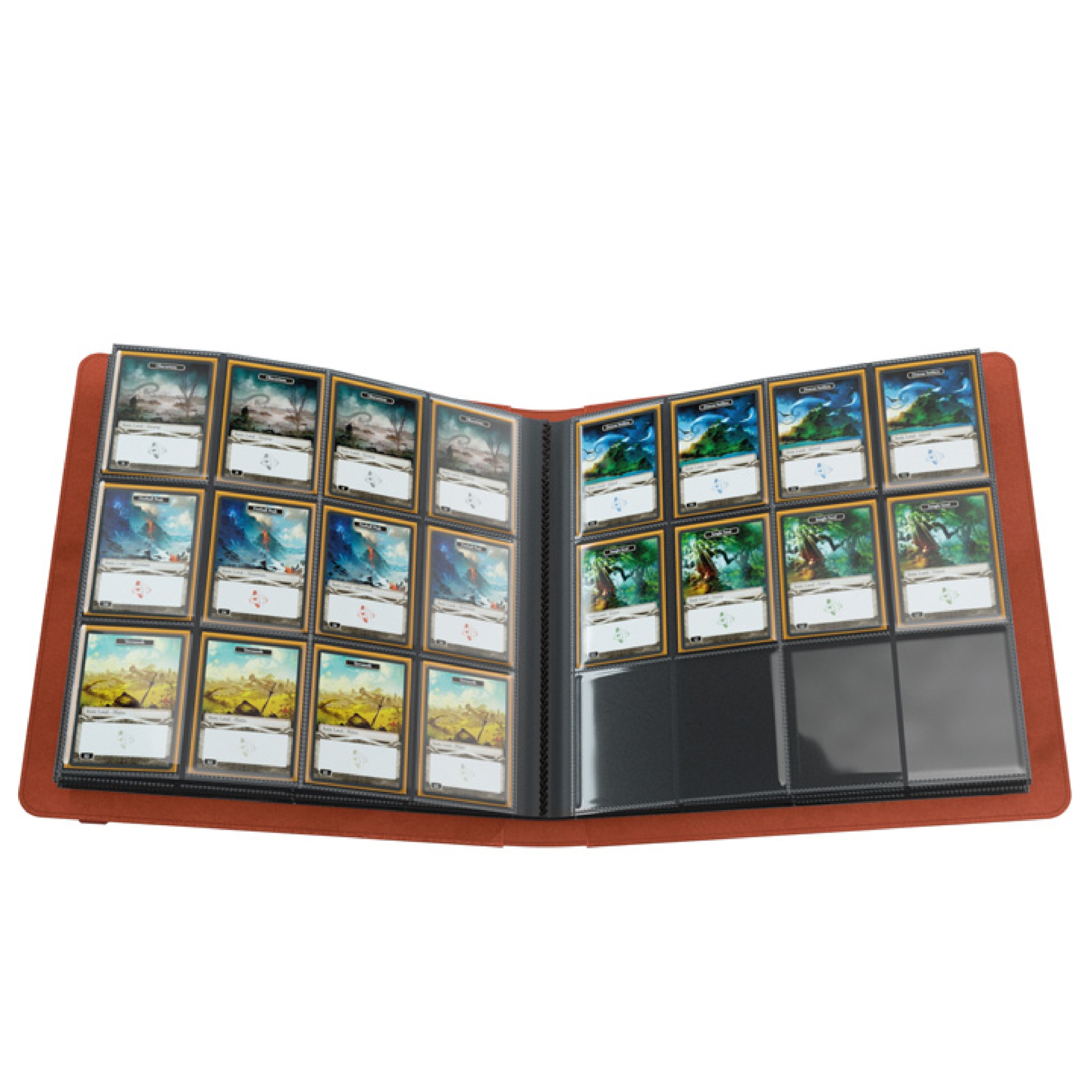 - 20 side-loading pages to hold up to 480 sleeved cards; - COLORMATCH: Cover, inner lining and strap in matching colors; - Extra-wide elastic strap with reinforced stitching; - 24 side-loading pockets perpage keep cards shake-safe; - Perfect for PLAYSET collections of 4 cards each; - Holds standard- and Japanese-sized cards; - Optimized for double-sleeved cards; - Rigid cover prevents warping of front or back side; - Premium materials (Nexofyber surface + microfiber inner lining); - Acid-free, no PVC.