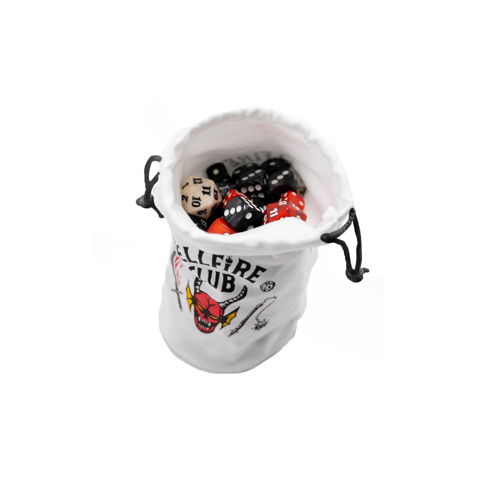 - Premium Dice Bag with a luxurious velvet feel - Integrated base keeps bag upright - Easy to open and safe closure with drawstrings - Iconic HELLFIRE CLUB design from the STRANGER THINGS series - Perfect for storing and transporting up to 130+ RPG dice - Perfect for any RPG, tabletop, and board game