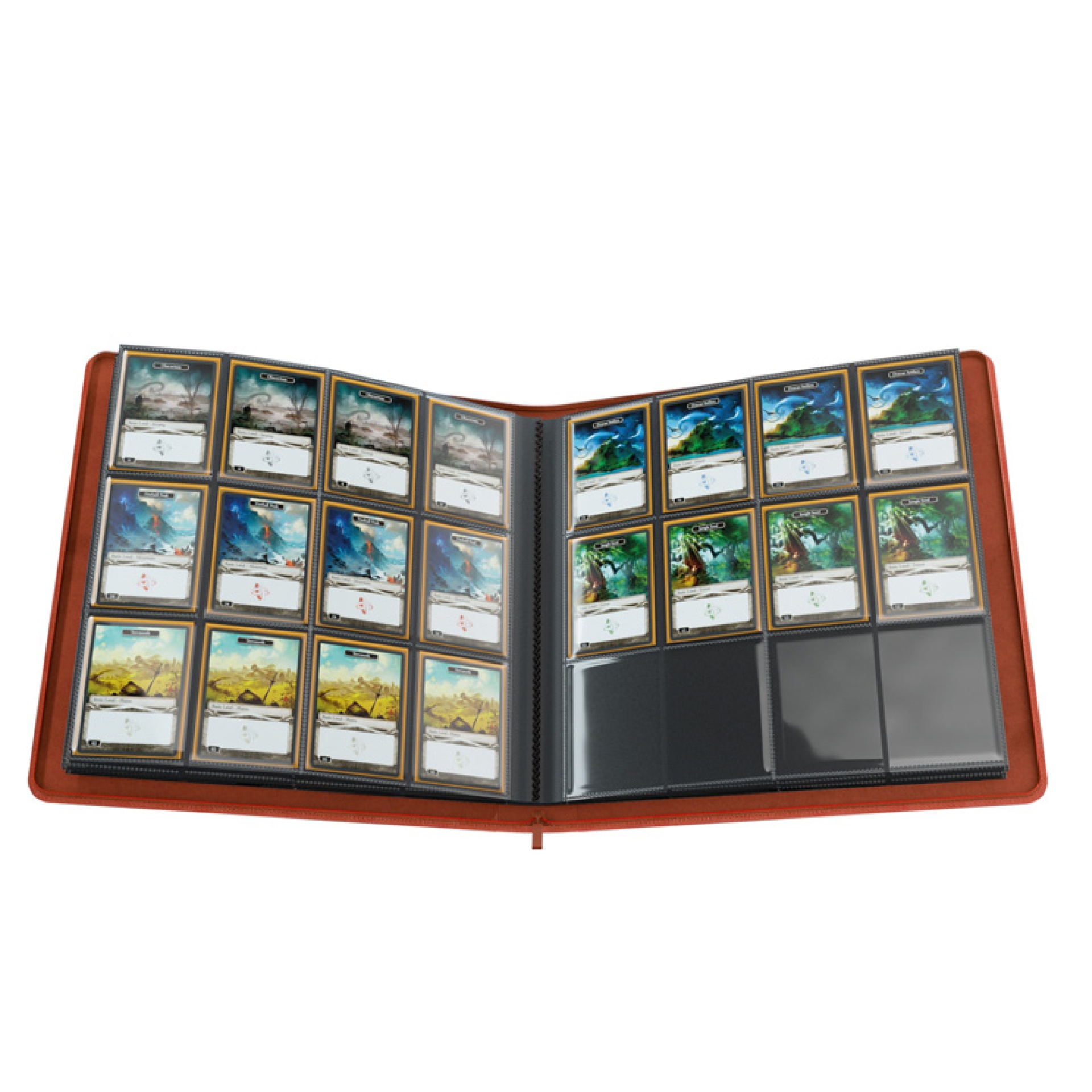 - 20 side-loading pages to hold up to 480 sleeved cards; - Uniquely designed zipper puller for maximum grip; - 24 side-loading pockets per page keep cards shake-safe; - Holds standard and Japanese-sized cards; - Optimized for double-sleeved cards; - Rigid cover prevents warping of front or back side; - Premium materials (Nexofyber surface + microfiber inner lining); - Inner microfiber lining in matching color; - Acid-free, no PVC.