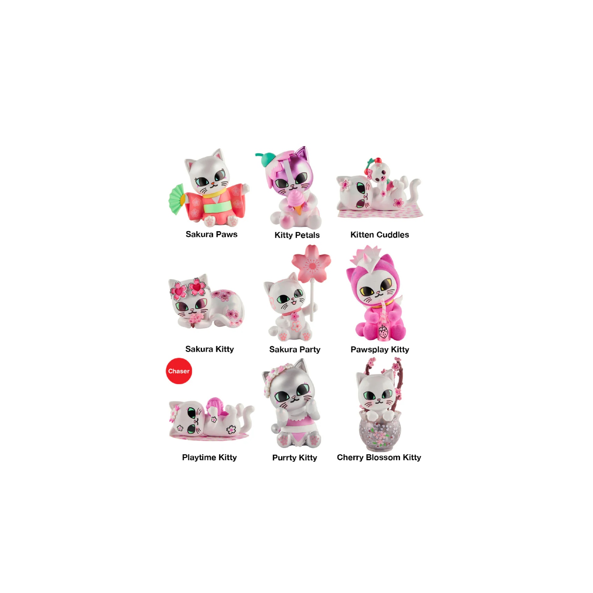 - Characters include: Cherry Blossom Kitty, Pawsplay Kitty, Kitten Cuddles, Sakura Party, Purrty Kitty, Sakura Kitty, Sakura Paws, Kitty Petals and Playtime Kitty (chaser!) - Features may include transparent, iridescent, metallic detail and more! - Chaser ratio: 1 in 48