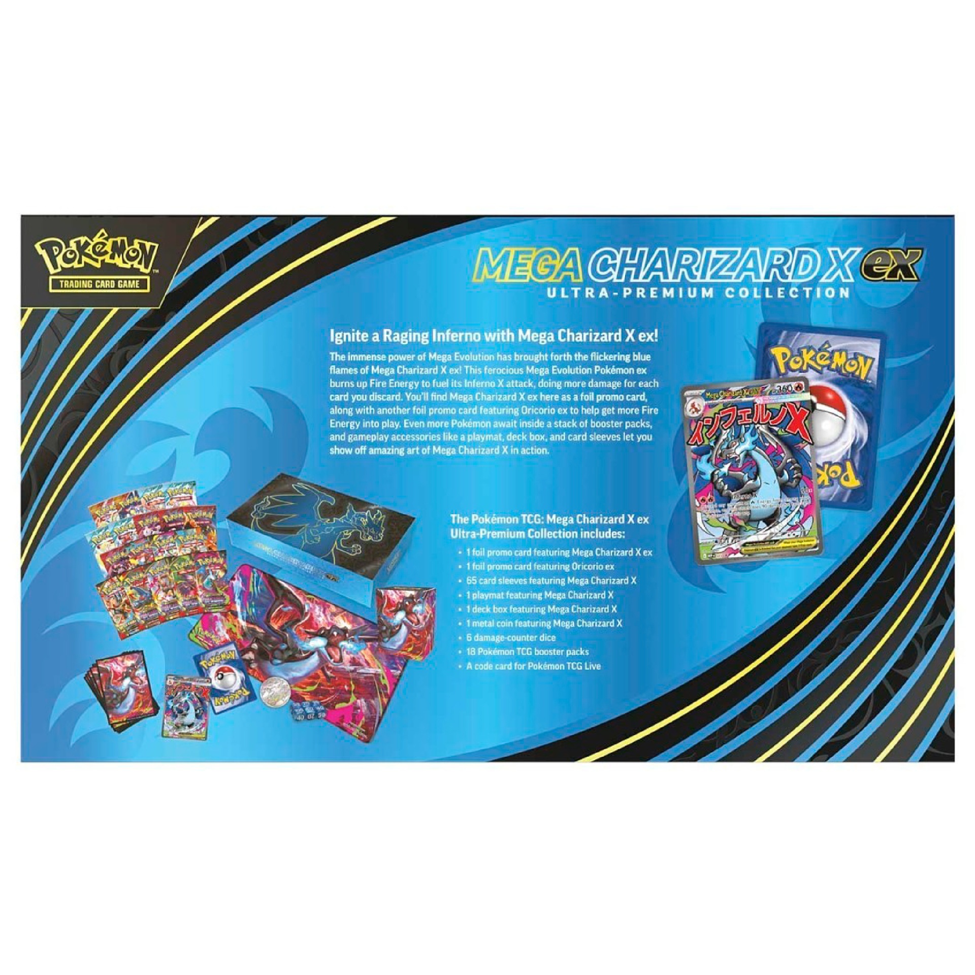 - 1 foil promo card featuring Mega Charizard X ex - 1 foil promo card featuring Oricorio ex - 65 card sleeves featuring Mega Charizard X - 1 playmat featuring Mega Charizard X - 1 deck box featuring Mega Charizard X - 1 metal coin featuring Mega Charizard X - 6 damage-counter dice - 18 Pokémon TCG booster packs - A code card for Pokémon TCG Live