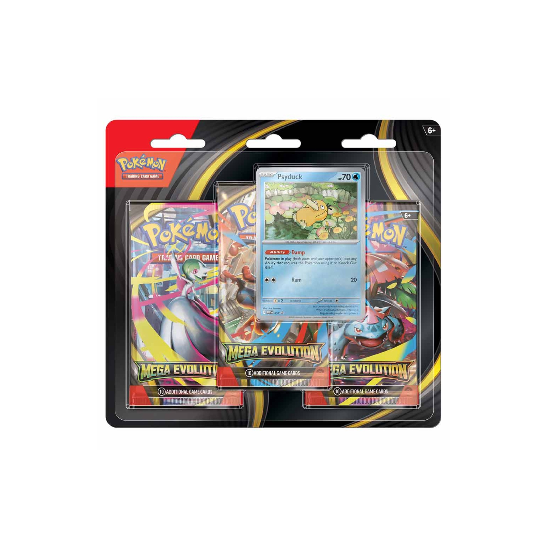 - 3 Pokémon TCG: Mega Evolution booster packs - Each booster pack contains 10 cards, 1 Basic Energy, and 1 Pokémon TCG Live code card. Cards vary by pack. - 1 foil promo card featuring Psyduck