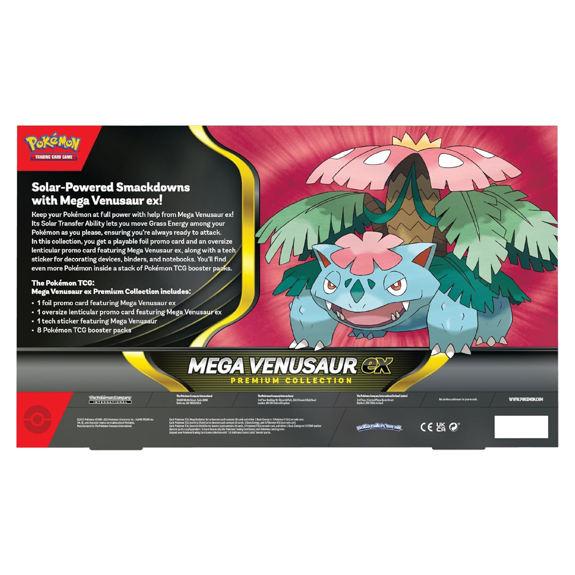 - 1 foil promo card featuring Mega Venusaur ex - 1 oversize lenticular promo card featuring Mega Venusaur ex - 1 tech sticker featuring Mega Venusaur - 8 Pokémon TCG booster packs