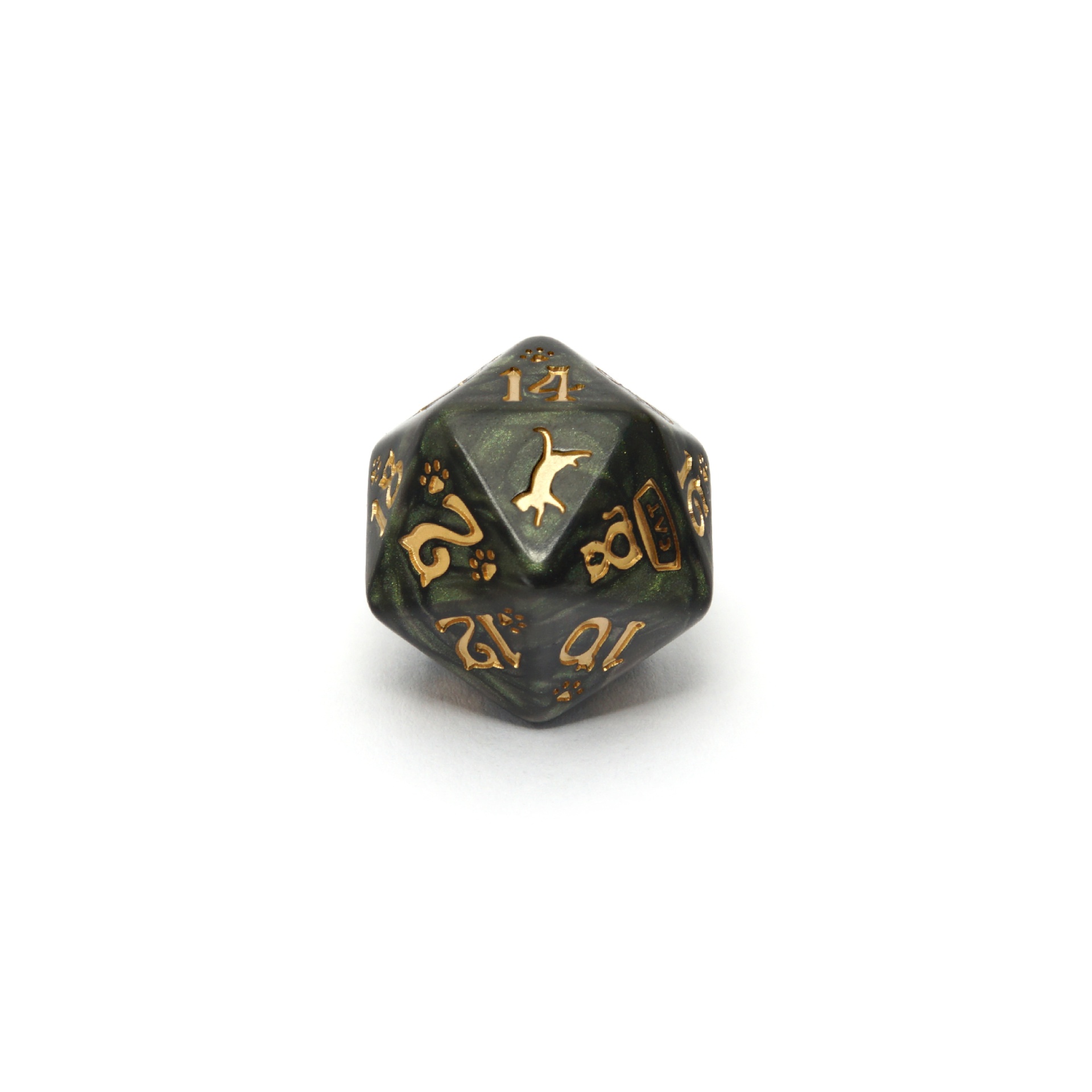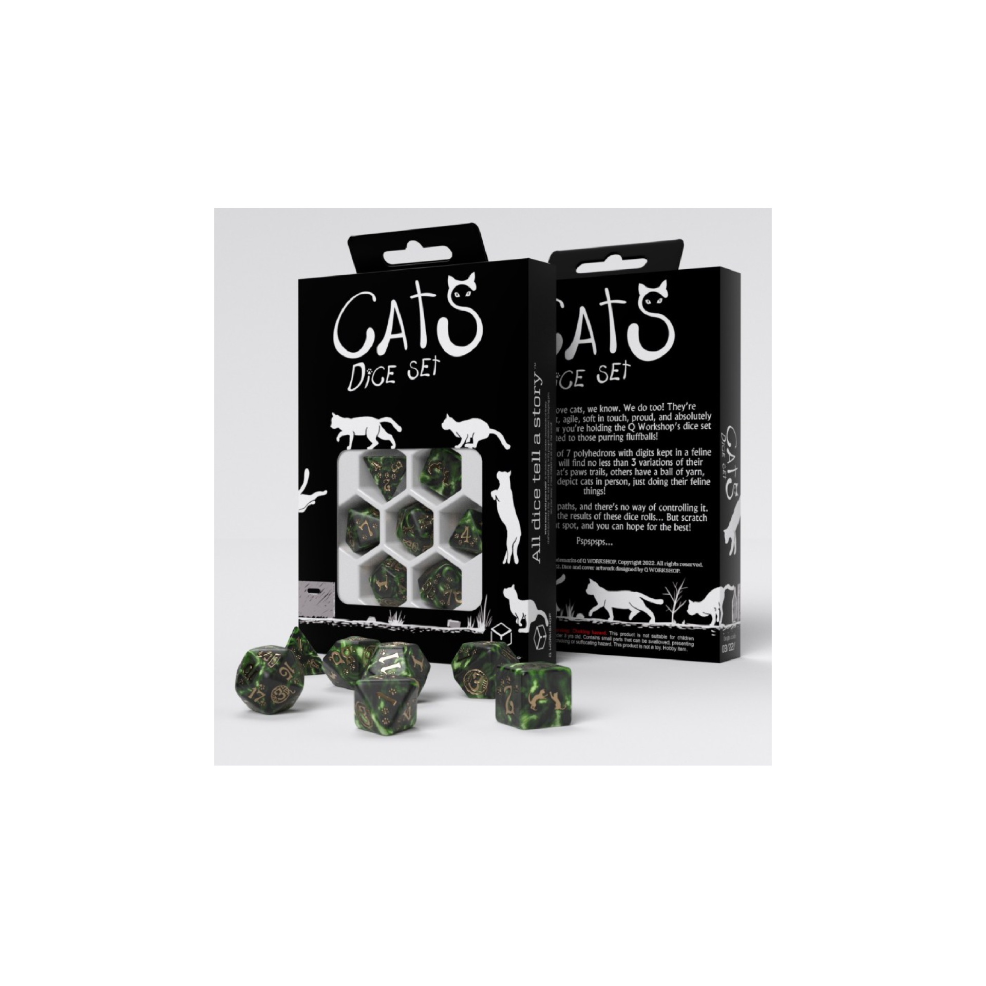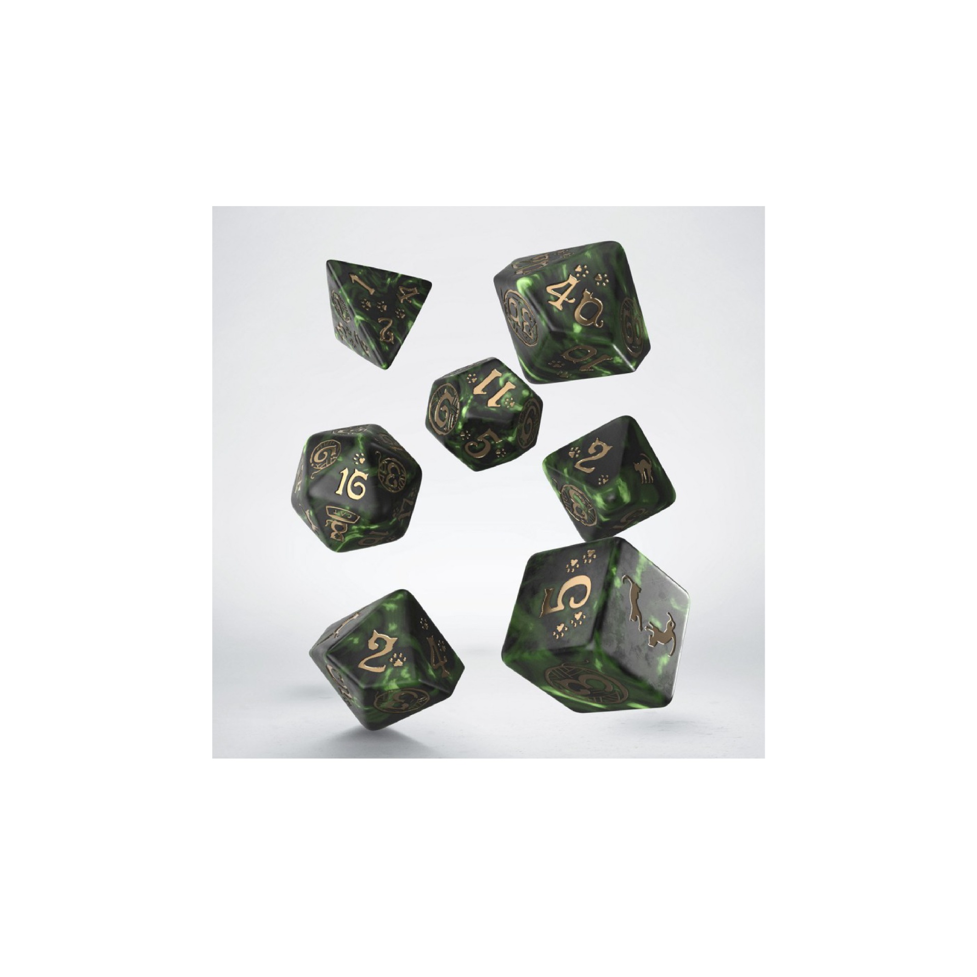 The Cat's Dice Set is remarkable not only because we dedicated it to our furry rulers… err, comrades. First of all, each dice is different - on the highest faces, there are cats indulging themselves as they please. Additionally, some faces show one of their favorite things: a bowl of food or a ball of yarn! When you look closely, you will also see traces of a cat's feet -- because who will forbid them to walk on something freshly painted?