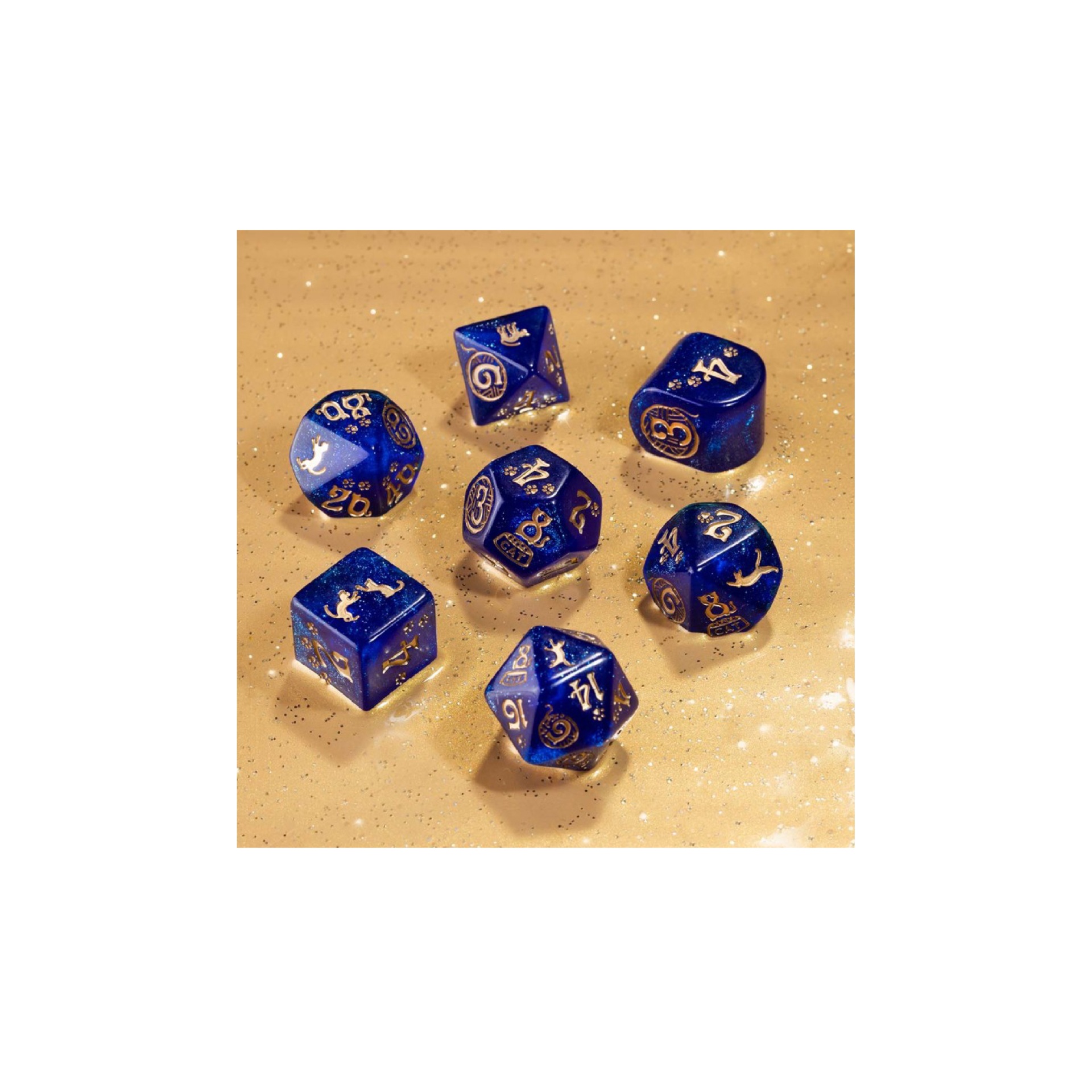 A Jinxer — The background of the dice is shimmering blue, with matte-gold paintings.