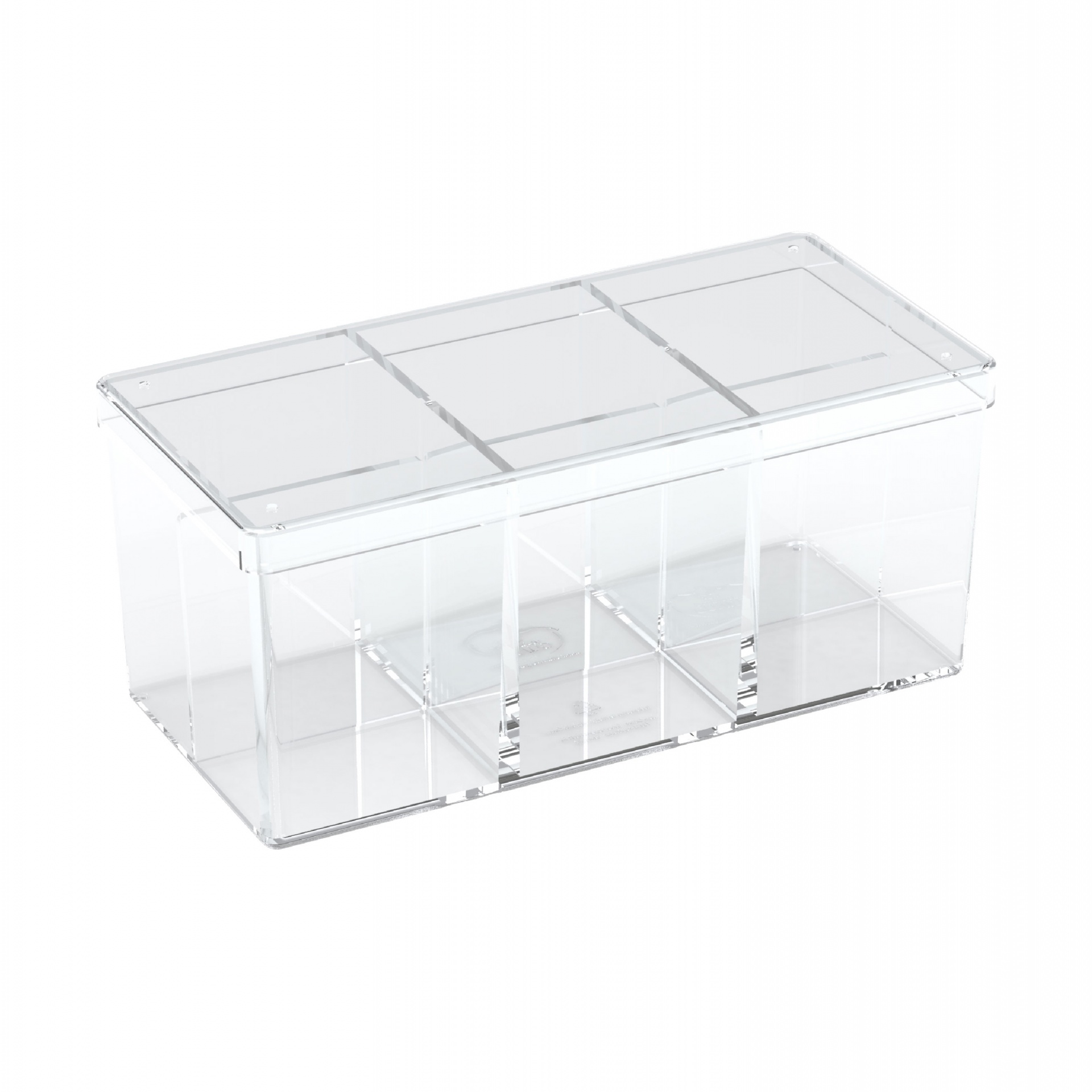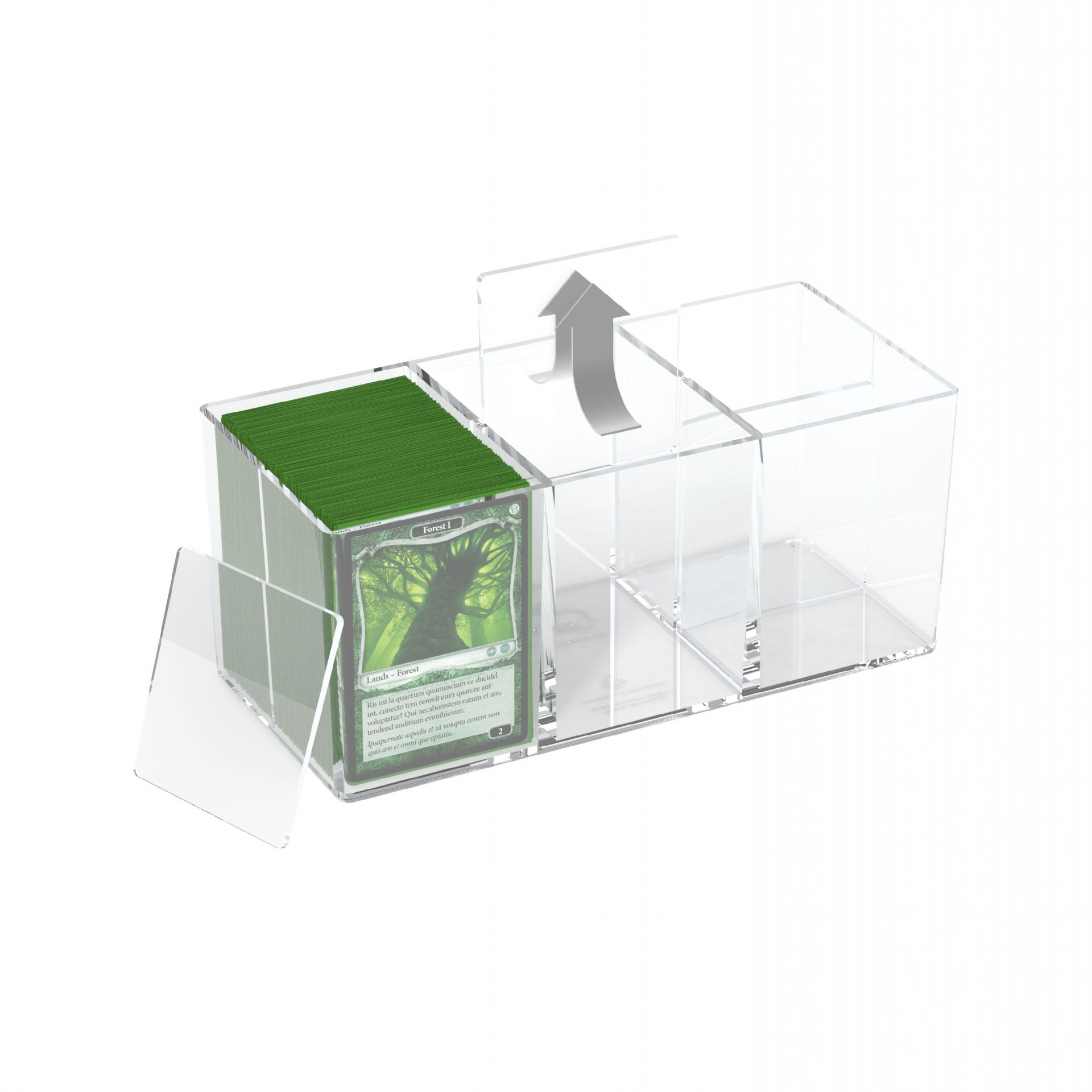 - Capacity: 480 cards in sleeves (approx. 930 cards without sleeves); - Designed for 6 decks of up to 80 cards in sleeves each; - Very high clarity without any coloring (no blue cast); - Stackable; - 3 removable dividers; - Outer dimensions: 223 mm W x 98 mm H x 102 mm D; - Material: polystyrene.
